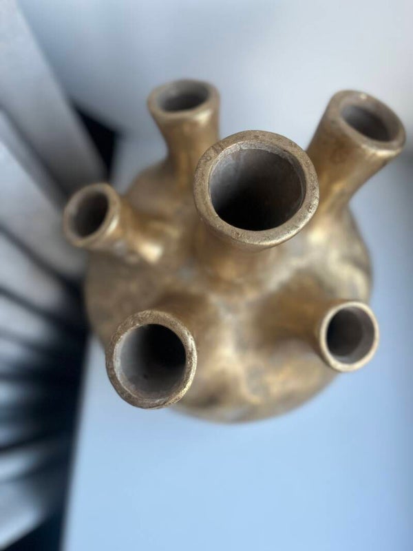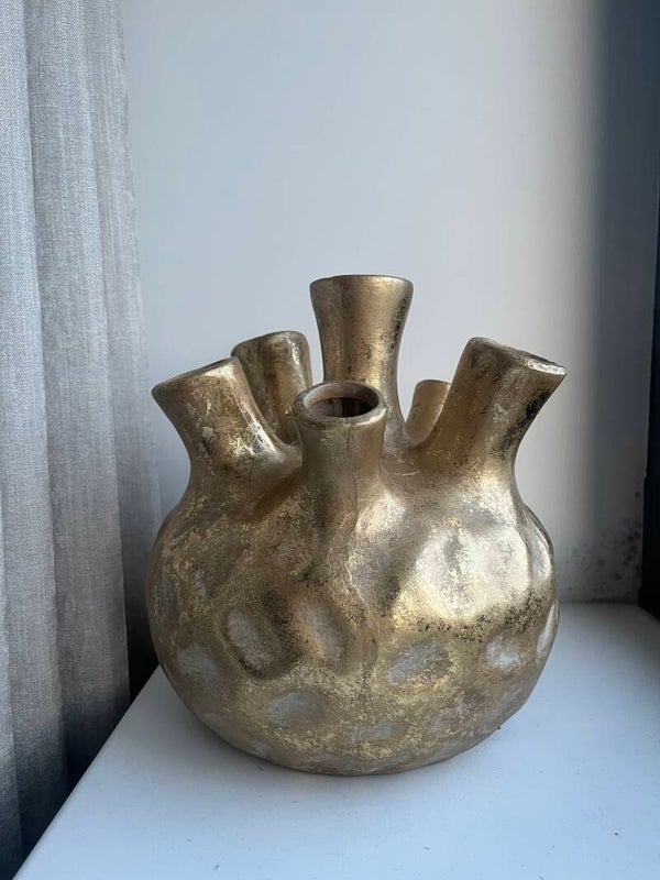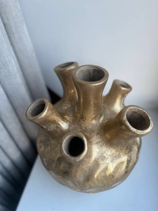 Deze gouden tuit vaas is gemaakt van sterk antique goudkleurig aardewerk. De vaas heeft 6 openingen waarin je prachtige kunsttulpen of andere zijde bloemen in kunt zetten. En is een echte eye Cather voor in je interieur!