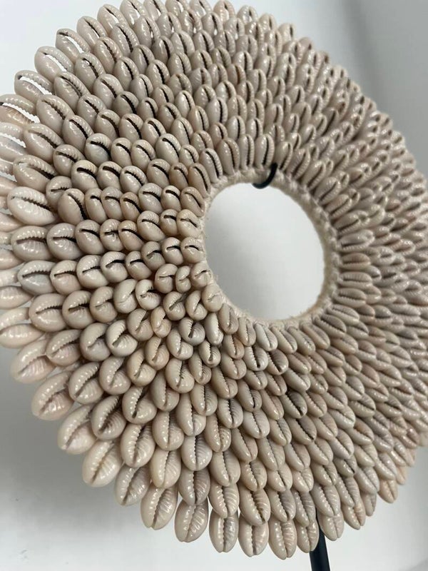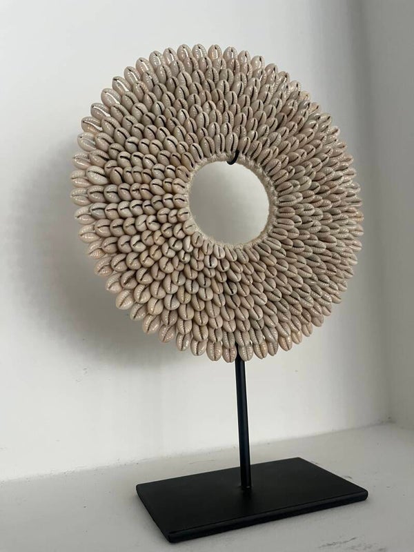 Dit handgemaakte decoratieve ornament uit Bali is een echte blikvanger in ieder interieur. Het ronde design, vervaardigd uit zorgvuldig geplaatste schelpen, straalt een natuurlijke elegantie en rust uit. Het ornament is bevestigd op een strakke zwarte metalen standaard, wat zorgt voor een mooi contrast tussen organisch en industrieel. Perfect als statement piece op een dressoir, plank of in een open kast.